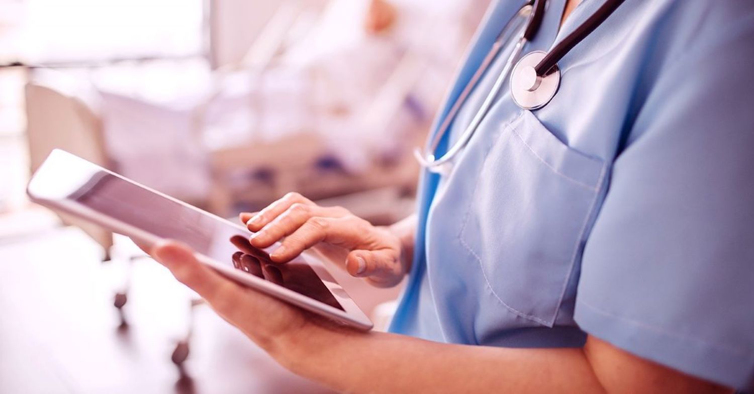 Vårdpersonal med stetoskop kollar i telefonen