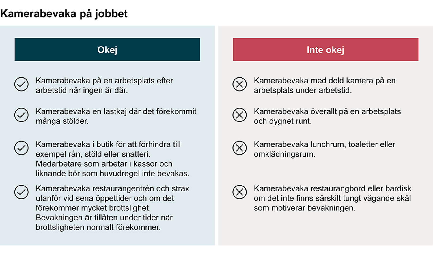 Det är känsligt att kamerabevaka en arbetsplats och det krävs särskilda skäl för att det ska vara tillåtet. Det är viktigt att medarbetare inte bevakas i större utsträckning än vad som är nödvändigt för att exempelvis förhindra olyckor eller förebygga brott. Samtidigt finns det arbetsplatser där det ofta är tillåtet med viss kamerabevakning. I butiker är det tillåtet att bevaka för att förhindra och utreda stölder. På snabbmatsrestauranger kan det också finnas anledning att kamerabevaka under vissa tider, till exempel nattetid för att skapa trygghet.